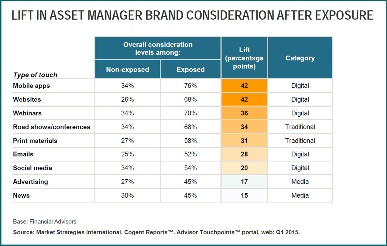 On average, more than three-quarters (76%) of advisors exposed to asset managers’ proprietary mobile apps indicated they are likely to increase business with the firm, compared with only 34% of advisors who were not exposed (a 42-percentage-point lift). Similarly, two-thirds (68%) of advisors who visited an asset management website said they are likely to increase investments with the company, compared with just one in four (26%) advisors who did not visit those same websites. Ranked third in lifting consideration, webinars delivered a 36-percentage-point lift, with twice as many attendees being likely to consider investing in the sponsors’ product offerings (70% vs. 34%, respectively).